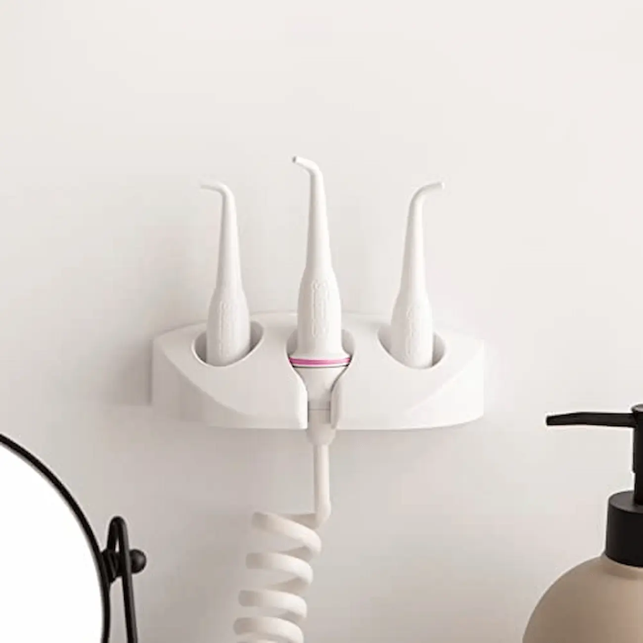 Otro de sus mayores atractivos es la base que incluye para colgar de la pared del baño y que no ocupe mucho espacio en el lavabo.