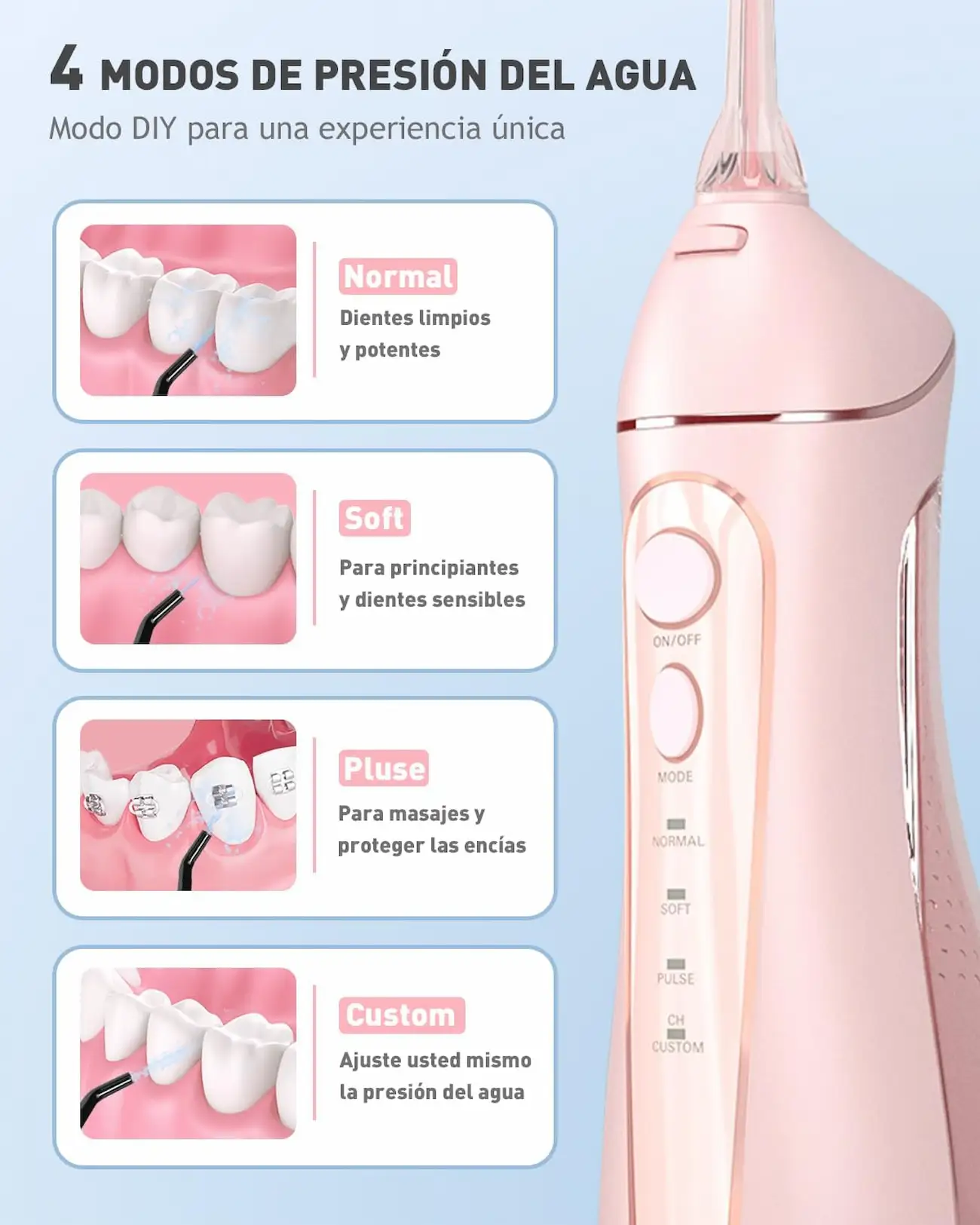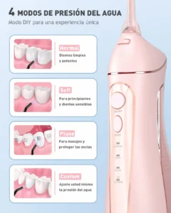 Al pulsar el botón MODE puedes alternar entre sus cuatro modos de limpieza; Normal, Suave, Pulso y Custom, que combinado con su juego de 5 boquillas podrás adaptar a las necesidades específicas de su boca.
