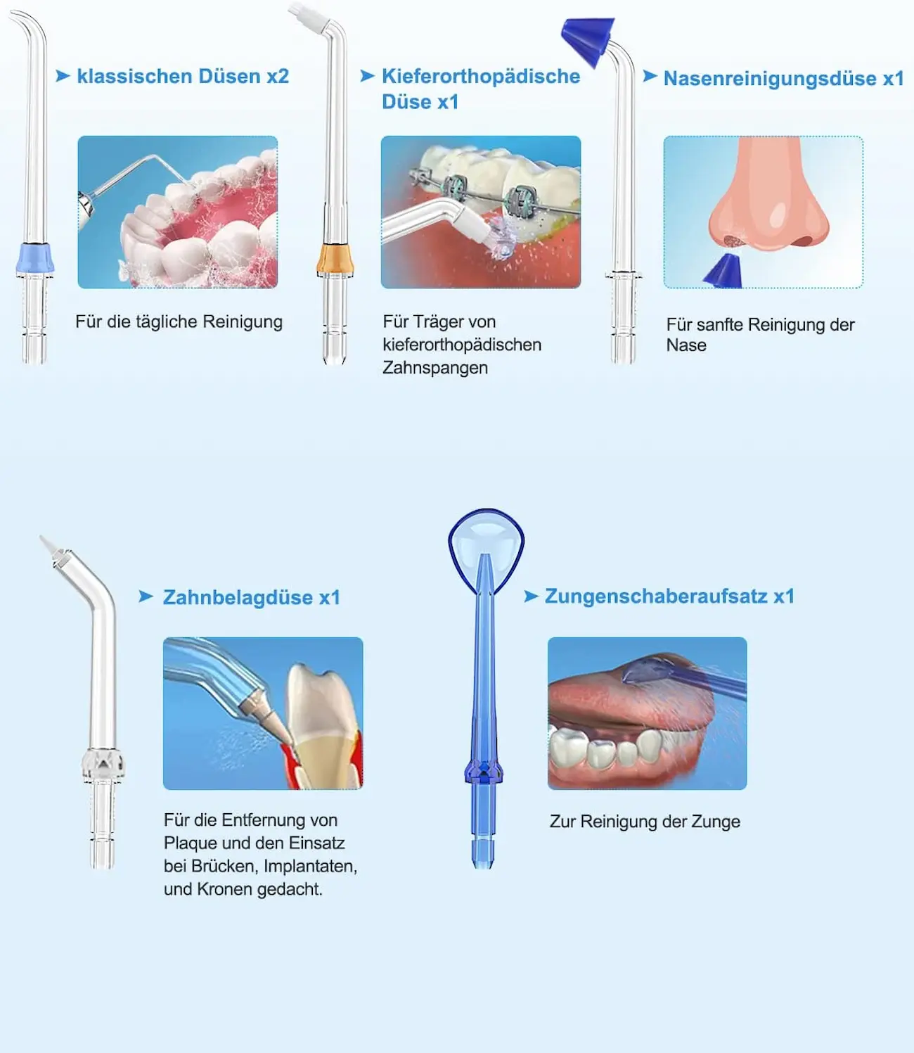 Un irrigador pequeño, compacto, completamente desmontable, pensado para utilizar en el trabajo, al salir a comer en un restaurante o cuando salga de viaje. Si bien no podemos decir que pueda igualar a los modelos de sobremesa, es perfecto para cualquier usuario gracias a su completo juego de boquillas.