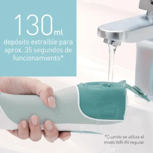 Con su depósito de 130 ml ofrece cerca de 1 minuto de agua, pudiendo usarse 15 minutos de manera interrumpida. El depósito de agua, extraíble, puede limpiarse en el lavavajillas.