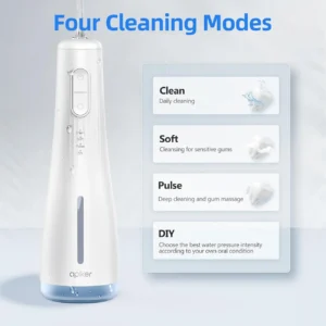El chorro alcanza una potencia de 1600 rpm, eliminando eficazmente la placa o restos de alimentos. Con sus cuatro modos de limpieza; Clean, Suave, Pulse y DIY, podrás elegir la potencia que mejor se ajuste a las necesidades particulares de tu boca.
