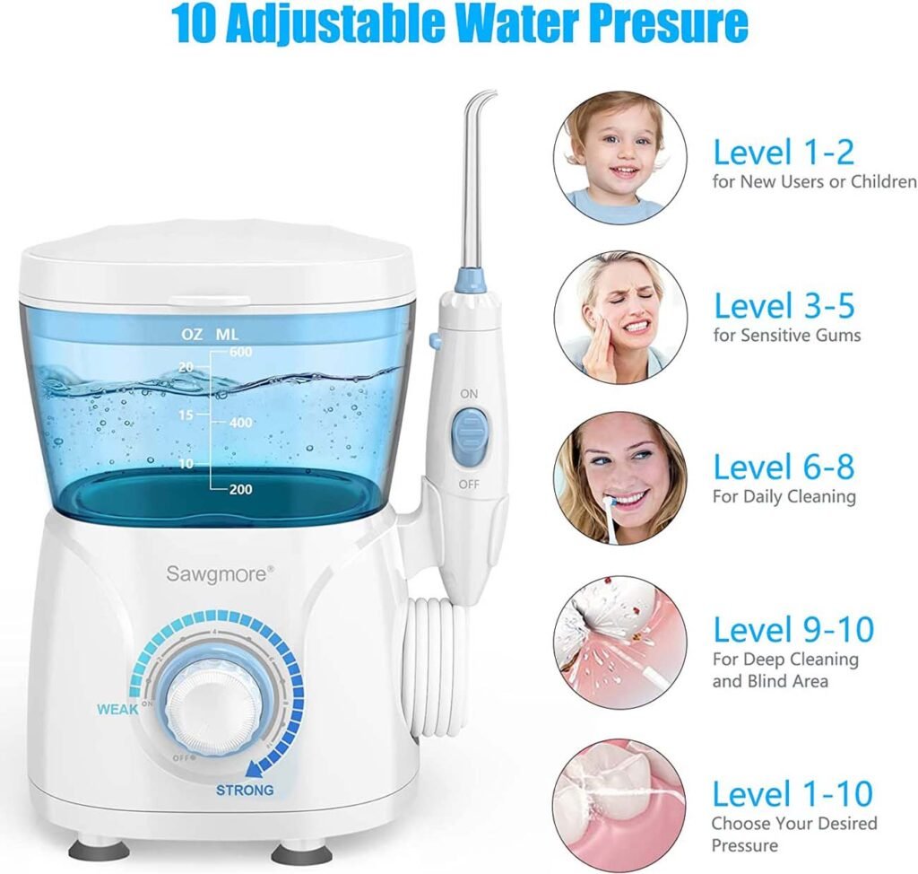 Sawgmore Irrigador Dental, Irrigador Bucal Profesional con 8 Boquillas Multifuncionales, 10 Ajustes de Presión del agua, Capacidad de 600ml, Limpieza Dientes, Aprobado por la FDA/CE Blanco