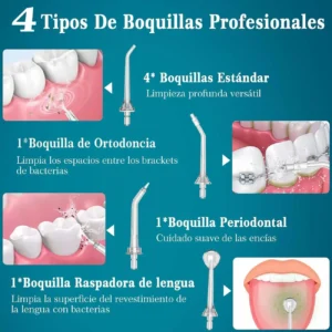 Lo que compras principalmente es un conjunto de instrucciones al que le han puesto más cosas, como un irrigador bucal y varias boquillas: 4 normales con aros de diferentes colores para poder repartir entre diversos usuarios, y 3 especiales (lengua, cepillo, fina).