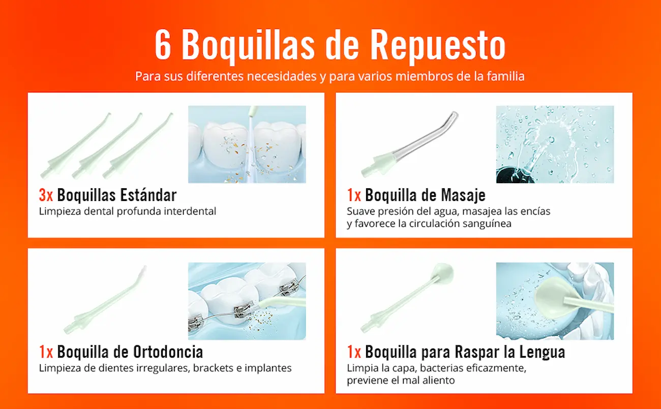 LF Irrigador Bucal, Irrigador Dental Portátil con 6 Boquillas, 4 Modos 220ML, Multifuncional Recargable, Profesional Lavado Pulsado, IPX7 Impermeable